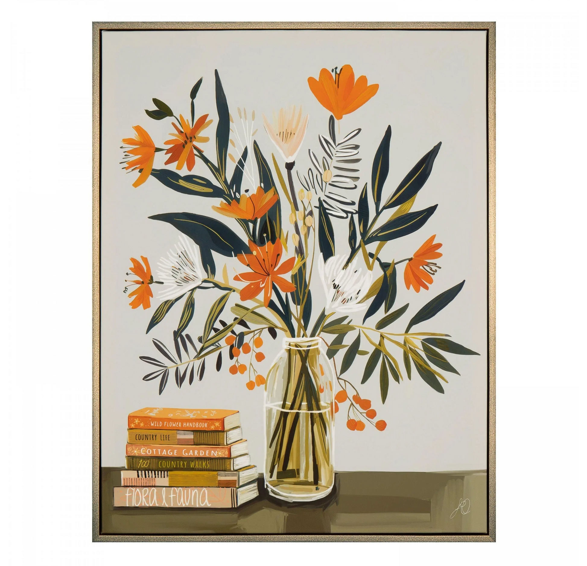 Exuding a mid-century style, a delightful floral arrangement graces an everyday vase. The bold colours and shapes of the blooms and berries create a vibrant display. A stack of earthy books, meticulously arranged, adds a sense of order and balance to the scene, symbolising an organic life.