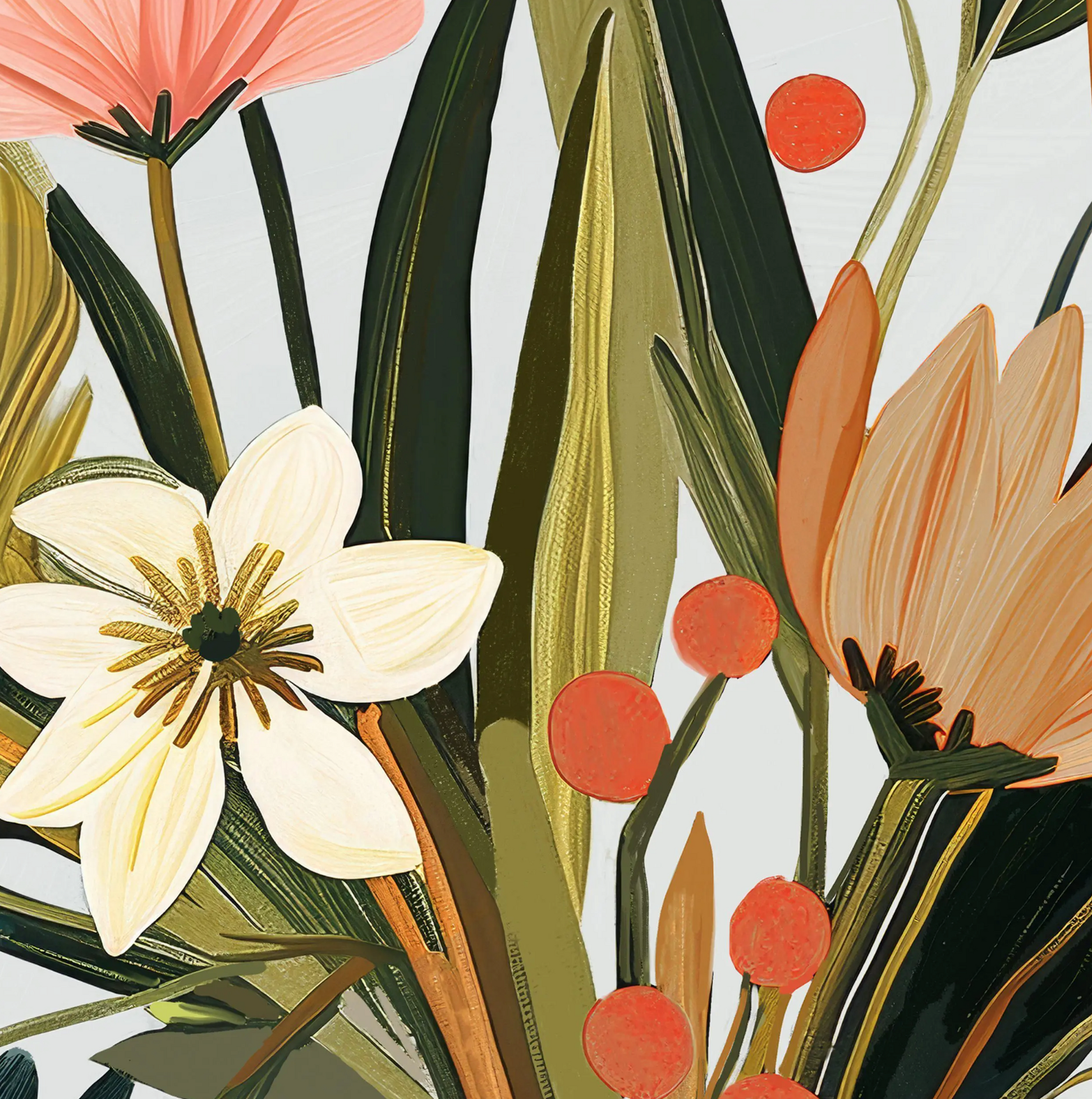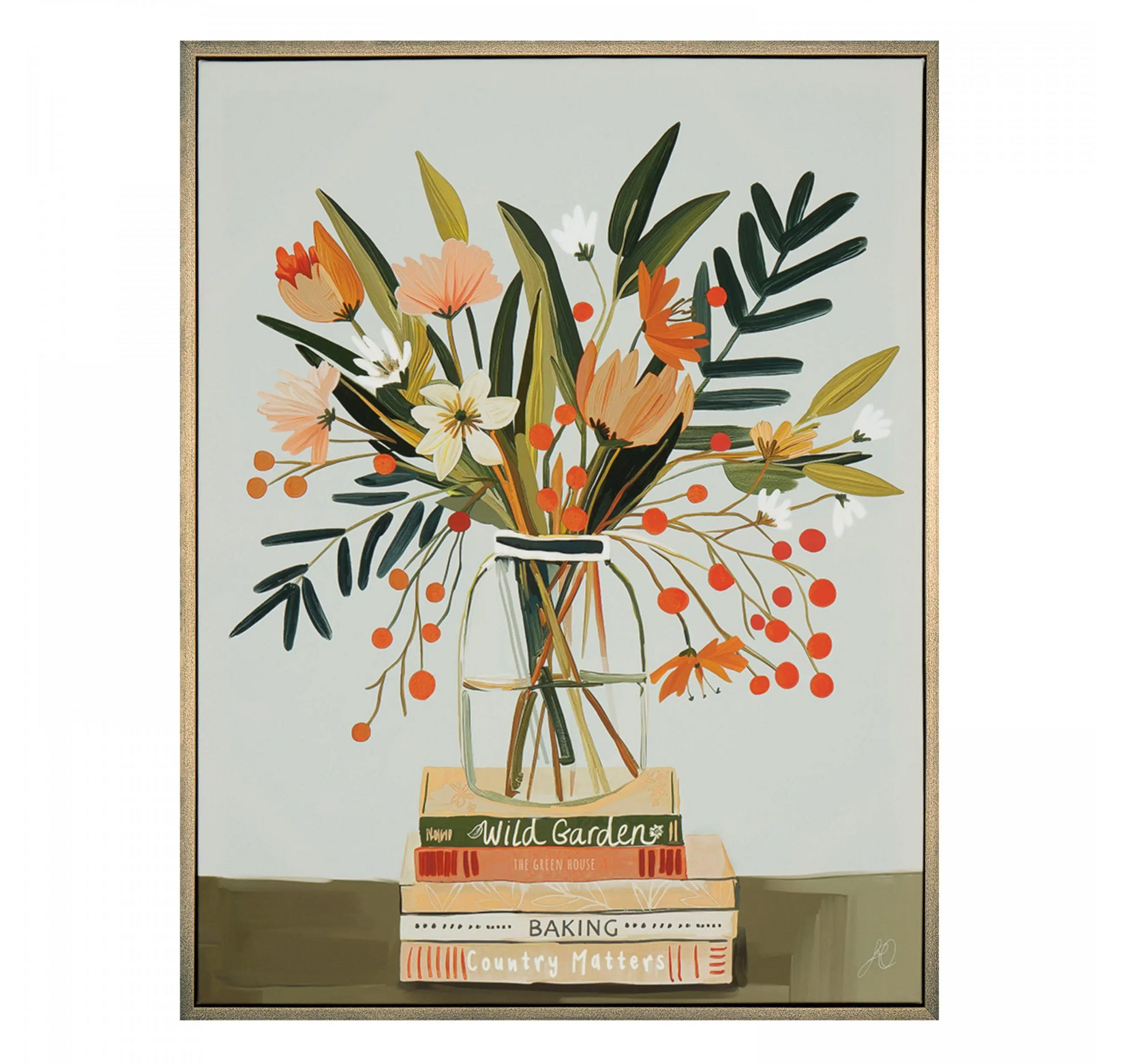 Exuding a mid-century style, a delightful floral arrangement graces an everyday vase. The bold colours and shapes of the blooms and berries create a vibrant display. A stack of earthy books, meticulously arranged, adds a sense of order and balance to the scene, symbolising an organic life.